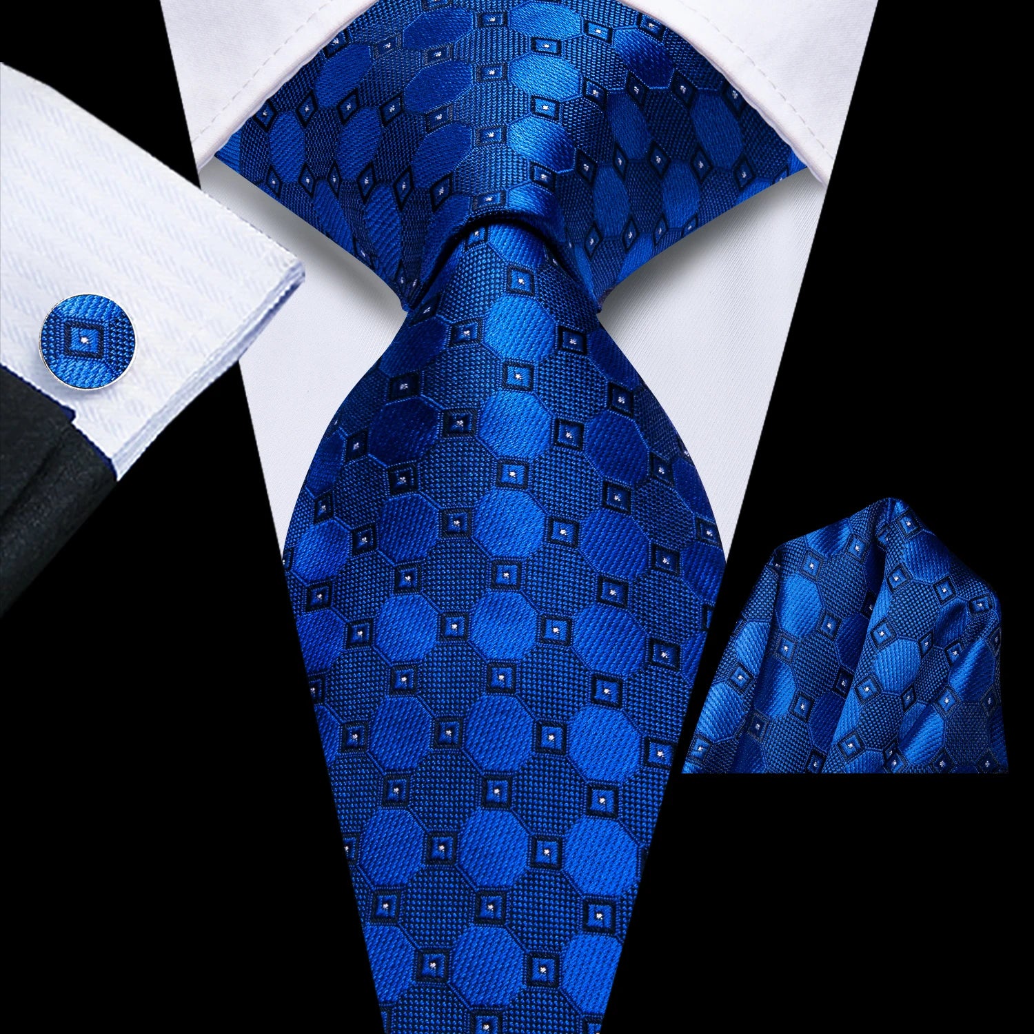 Blått slips, mansjettknapper og lommetørkle. Velg mellom flere varianter.