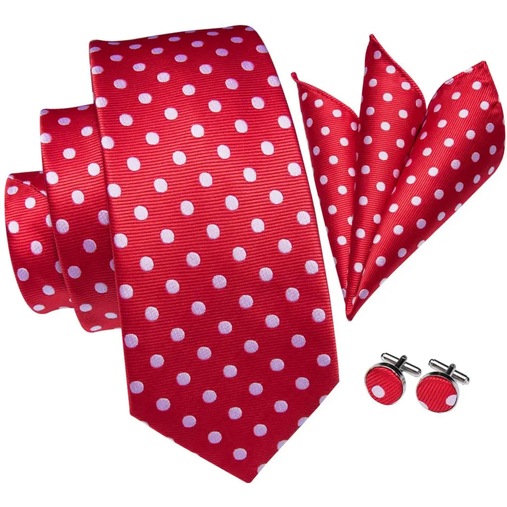 Rødt slips, mansjettknapper og lommetørkle. Velg mellom flere varianter.