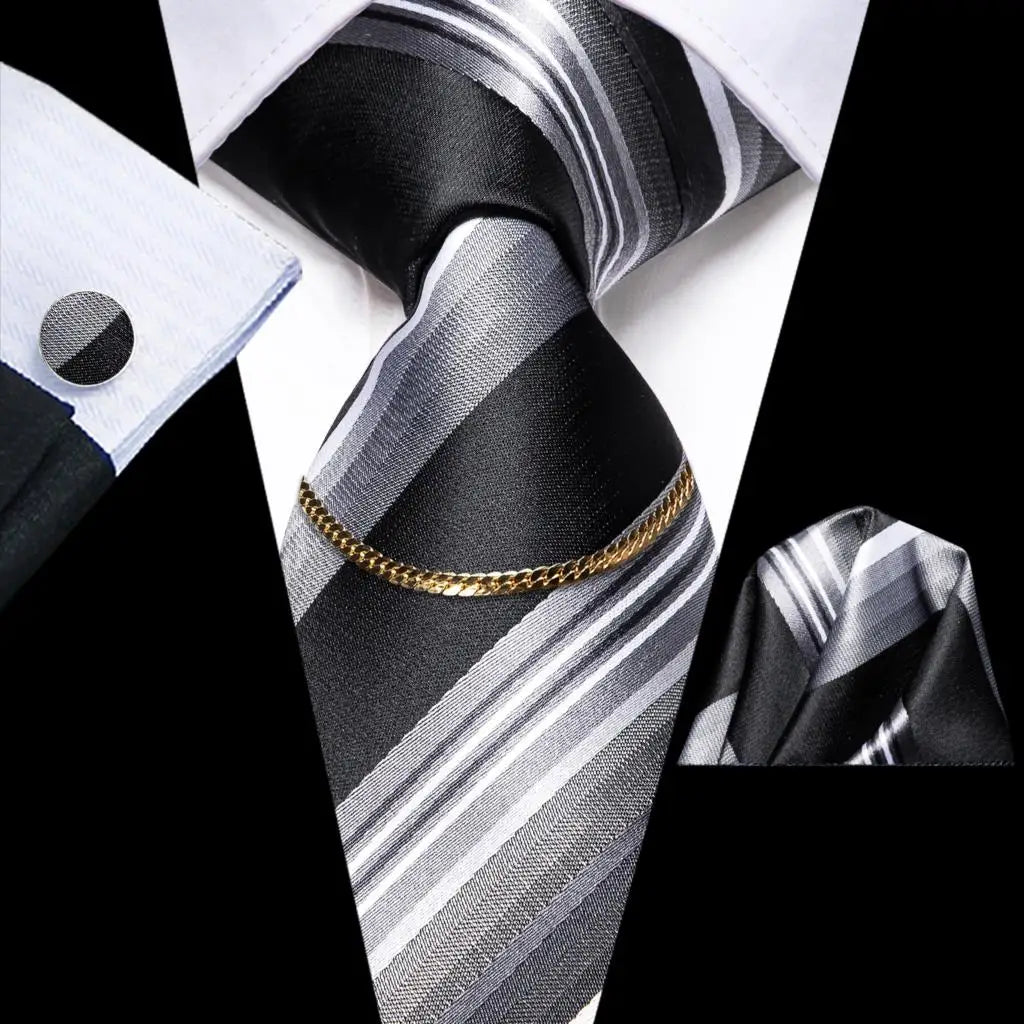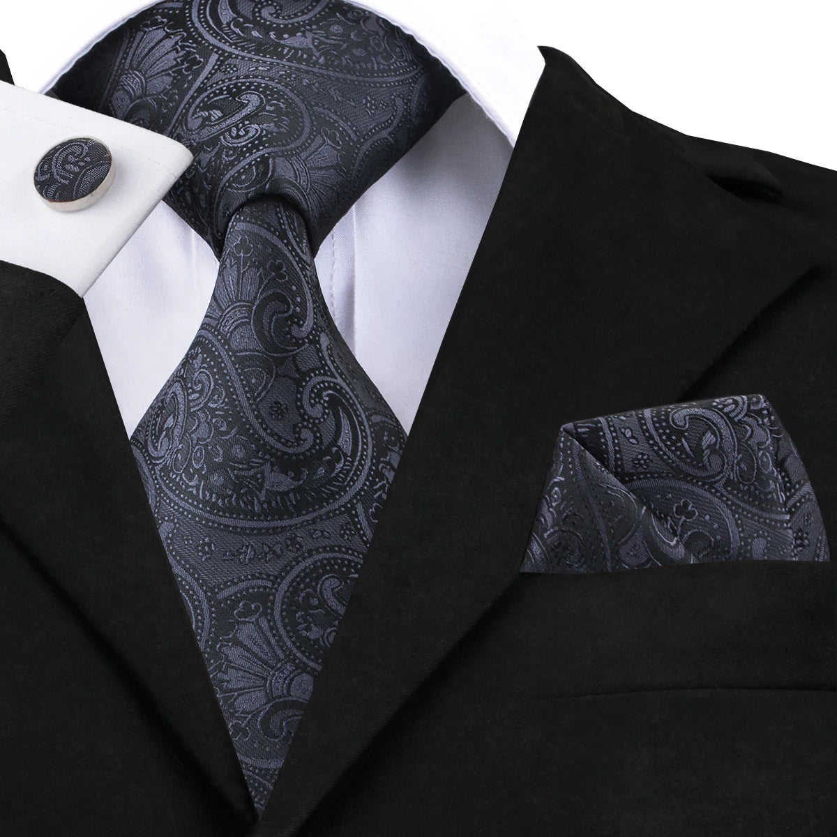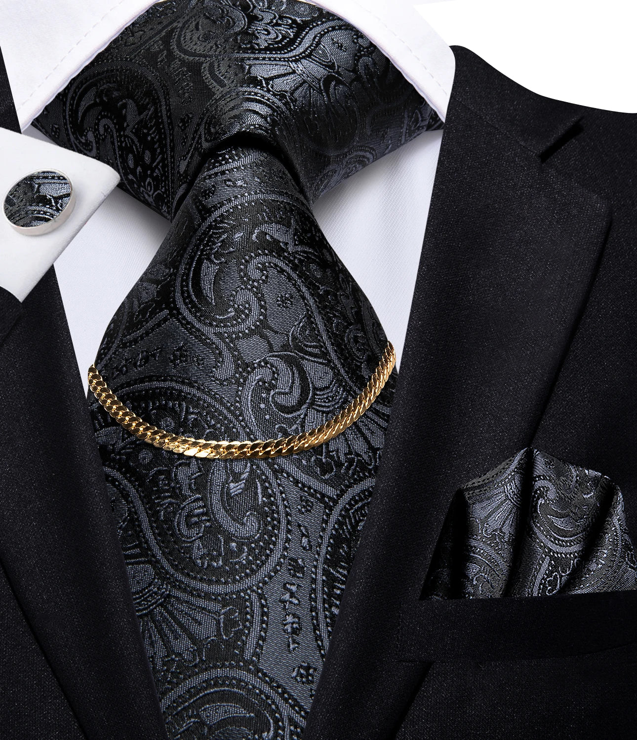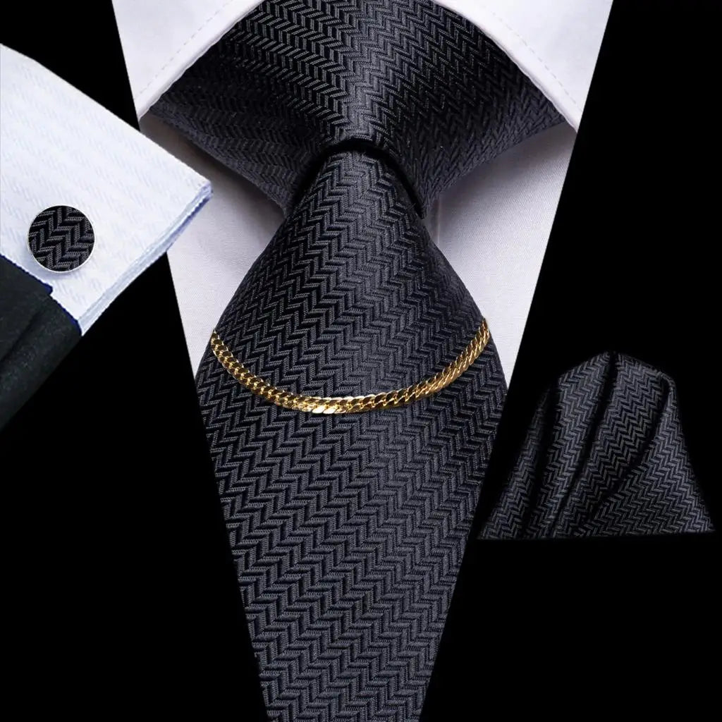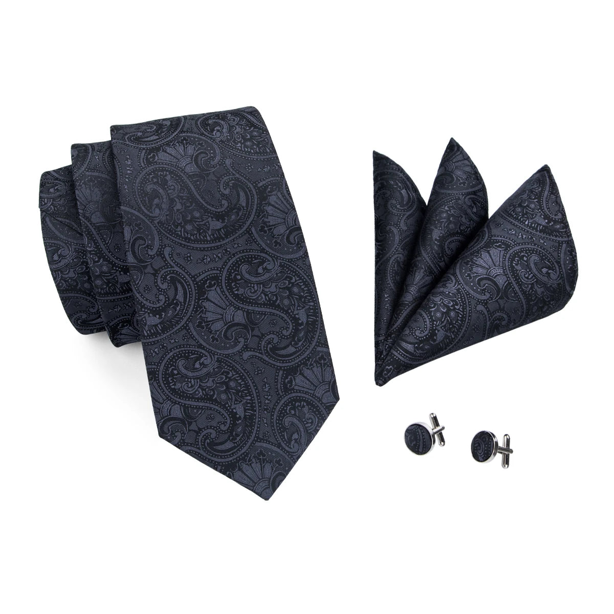 Svart slips, mansjettknapper og lommetørkle. Velg mellom flere varianter.